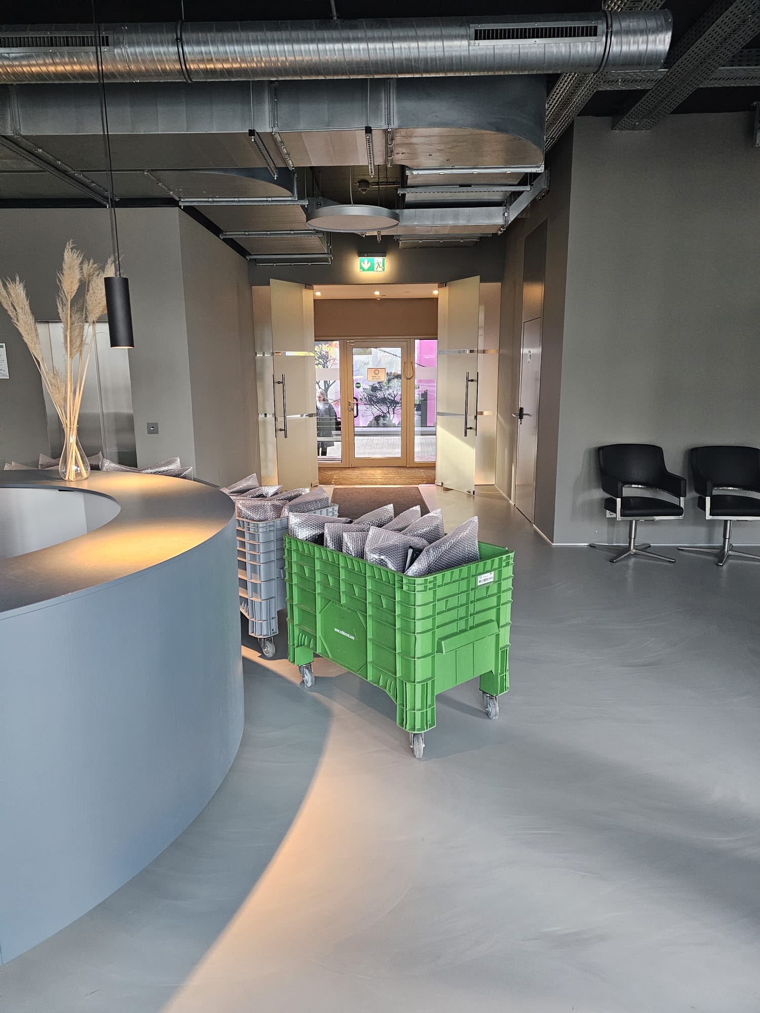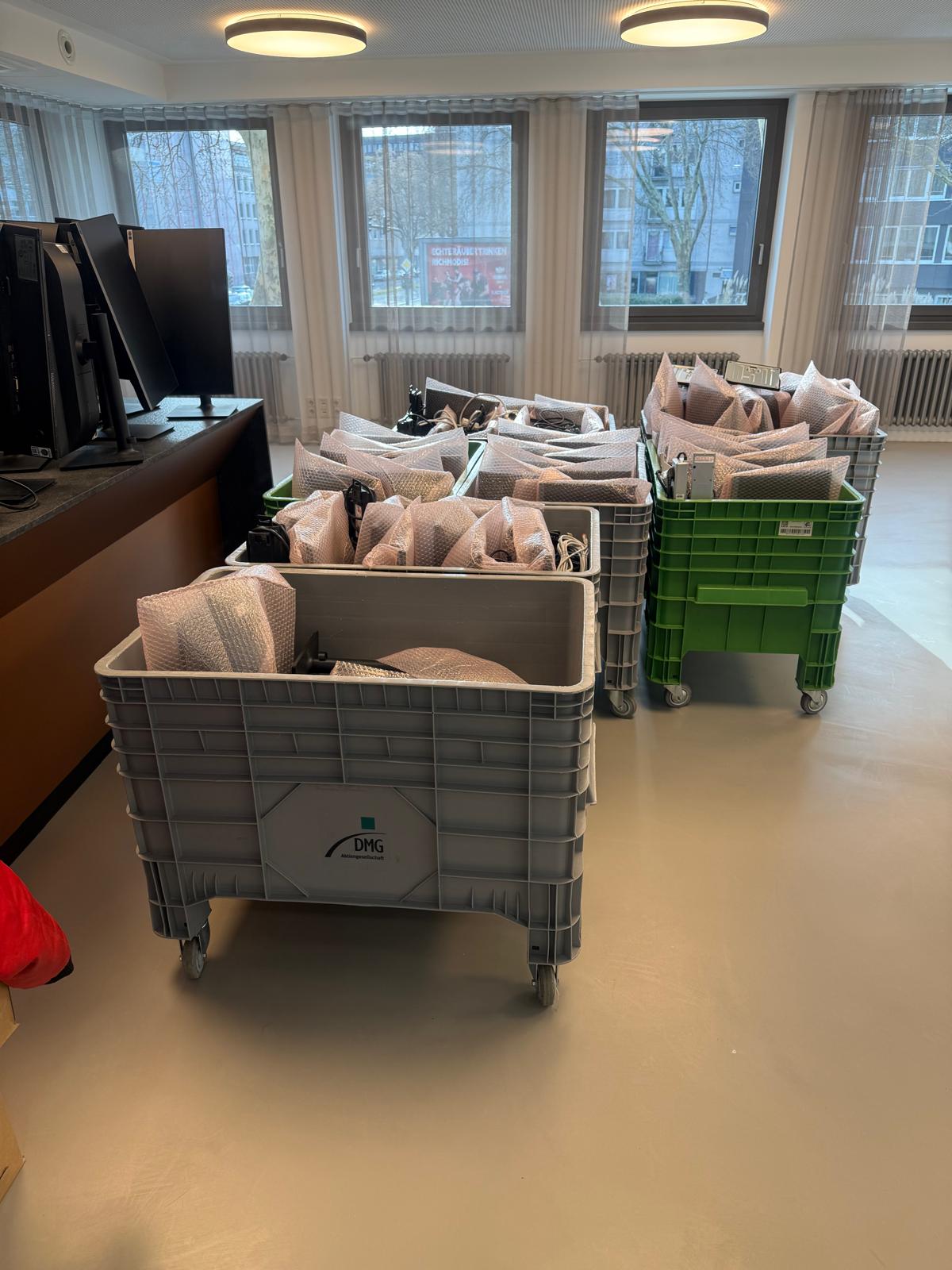 Anhand der vorbereiteten Rollcontainer und Systemboxen konnte man gut erkennen: Der Fokus lag stark auf IT-sicherem Transport und schneller Wiederherstellung der Arbeitsplätze.